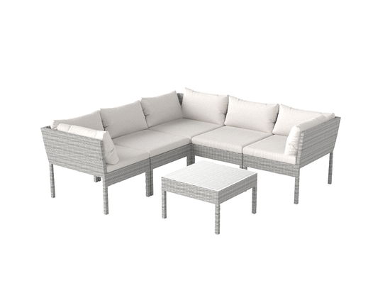 U loungeové soupravy Fantasia z řady New Classics jdou stylový šarm a pohodlné komfort ruku v ruce. Velkorysý design zahradní pohovky z polyratanu nejen dobře vypadá, ale je také pozoruhodně kvalitní: Bezúdržbová a práškově lakovaná hliníková konstrukce je lehká, robustní, odolná vůči povětrnostním vlivům a UV záření. Útulná sestava se skládá ze dvou rohových pohovek, jednoho centrálního rohu, dvou středových rohů a čtvercového konferenčního stolku se skleněnou deskou.