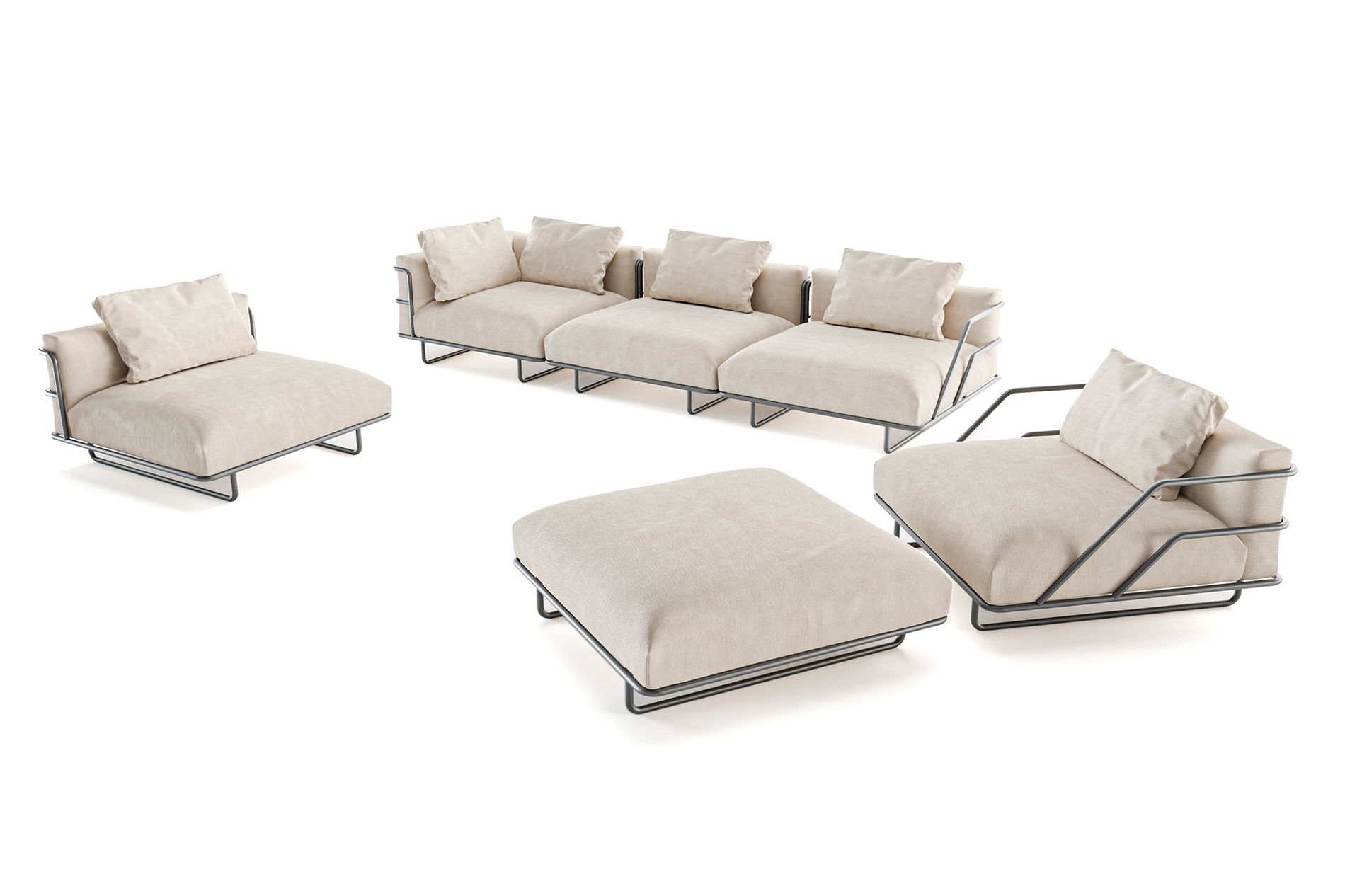 Obývací skupina Belaya v sobě spojuje nadčasovou eleganci a mistrovské řemeslné zpracování. Rám z nerezové oceli v antracitové barvě se setkává s potahy v pískové barvě a vytváří rovnováhu, teplo a trvalou krásu pro váš venkovní prostor.