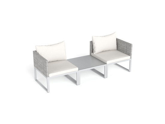 Rámy 3dílné pohovky jsou vyrobeny z hliníku. Opěradla a područky mají výplet z melírovaného polyrattanu. Pro pohodlí jsou na sedácích světlé polštáře. Když se pohovka používá jako lehátko, lze stolek také pokrýt polštářem a stane se tak střední částí lehátka. Tento pěkný set z City Collection je absolutním mistrem proměn s mimořádným šarmem.