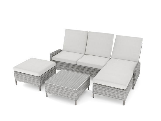 Loungový set Pimena z Classics Collection dodává každému venkovnímu prostoru a zimním zahradám útulnou, přívětivou atmosféru. Souprava se skládá z dvojmístné pohovky, pohodlné lehací pohovky, konferenčního stolku se skleněnou deskou a podnožky. Pomocí boční západky lze v případě potřeby naklonit opěradla a přizpůsobit je individuálním potřebám. Tento pěkný loungový set nevyžaduje mnoho prostoru, ale nabízí maximální pohodlí.