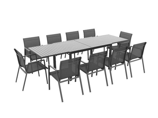 Jak stůl, který lze v případě potřeby jednoduše prodloužit, tak židle mají rám z robustního hliníku. Sedáky a opěradla jsou vybaveny moderním textilenovým potahem. Tento materiál má mnoho výhod: je odolný proti roztržení, prodyšný, elastický a navíc odolný vůči povětrnostním vlivům – nejlepší předpoklady pro léto pod širým nebem. Jídelní sada Remy je k dispozici ve velikostech L (6 židlí), XL (8 židlí) a XXL (10 židlí). Každá sada je doplněna praktickým rozkládacím stolem ze snadno udržovatelného hliníku.