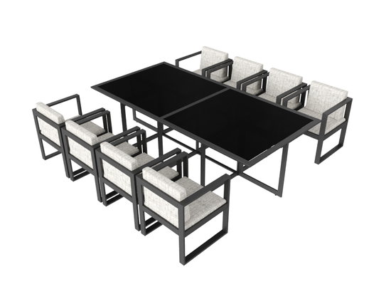 Jídelní set Ricardo Dining XL dokonale kombinuje chladnou eleganci a funkčnost. Skládá se z vysoce kvalitního stolu s hliníkovým rámem a skleněnými deskami a osmi pohodlných křesel. Zvláštností tohoto setu je, že můžete nábytek zcela zasunout, takže jídelní skupina vypadá jako kostka. To je mimořádně praktické, pokud chcete terasový nábytek v zimě úsporně uskladnit nebo pokud je prostor vaší terasy omezený.